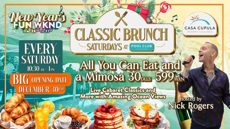 Casa Cupula Brunch is back! In addition to their already renowned Sunday brunch, The Pool Club At Casa Cupula adds a new Saturday classic brunch starting December 30th from 1030am until 1pm. The classic brunch promises your favorite American brunch favorites in a relaxed setting with top-notch entertainment hosted by and featuring local PV vocalist, Nick Rogers. Nick will be bringing you Classic and Broadway tunes along with rotating guests. Come enjoy the exquisite views, delicious dishes, and alluring music!