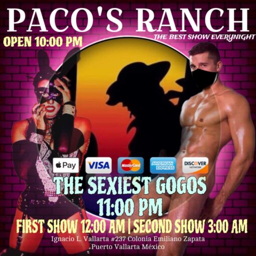 Pacos Ranch is Puerto Vallarta’s oldest gay dance club and now feature go go dancers every day. Shows start around 11pm.