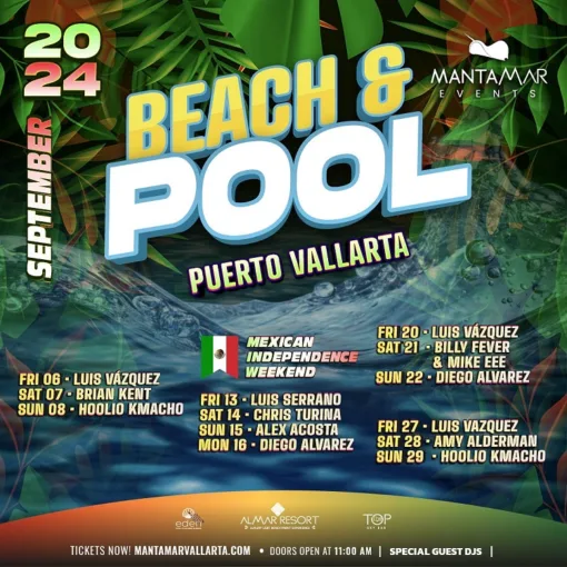 Please note during special event weeks and holidays, the pool parties may become other major events. For more Puerto Vallarta events visit the GAYPV event calendar here.Â