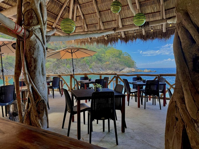 We are LOCATED approximately 45 minutes south of Puerto Vallarta on the little jewel of a beach named Los Colomitos. You can catch a cab or a bus to Boca de Tomatlan where our private water taxi service (there is a small fee of 100 pesos per person for our private taxi that goes to the driver to pay for his boat) will ferry you to our palapa covered veranda, perched over the ocean. More intrepid travellers can also walk in via the trail from Boca, a 30 minute adventure providing a taste of jungle terrain. Our large and loyal clientele will experience an adventure; our spectacular location, great service, and delicious food, as well as some Fresh surprises.