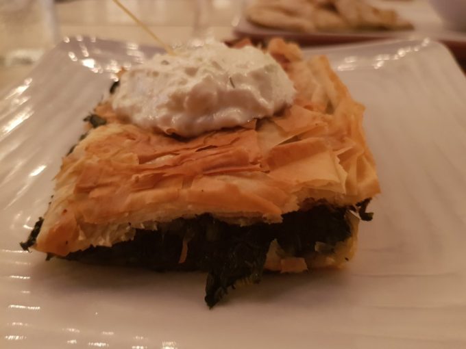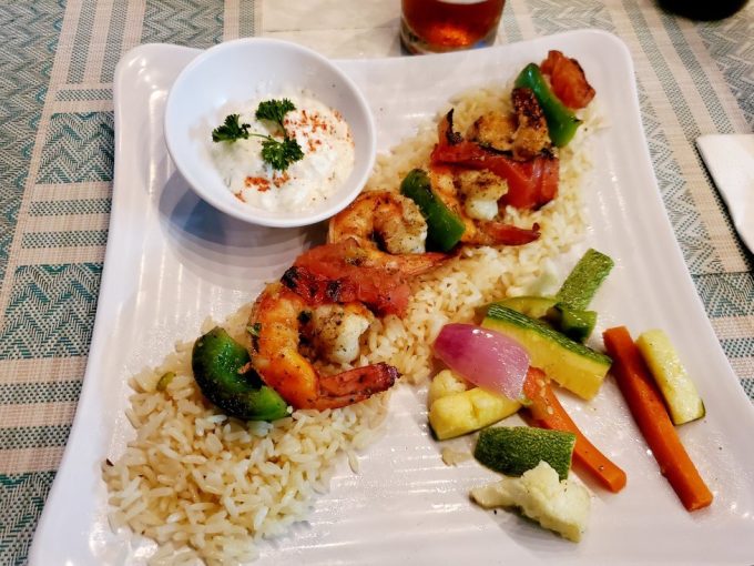 We started with the black olive tapenade and pita bread for an appetizer, and we both loved it, even though I usually don’t like olives. After that, the Greek salad we shared was the tastiest we’ve ever had, and our main courses were just incredible. I had the beef shishkebab and she had the Mykonos shrimp. Mine was the best, most tender beef I have ever enjoyed, and it was served with a feta cheese dip that was outrageously good.