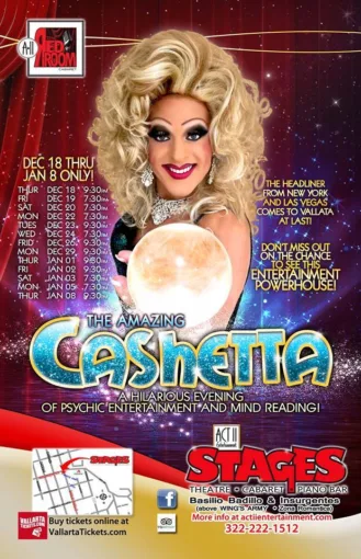 The amazing Cashetta was booked for magic and stand up shows in Puerto Vallarta, Mexico from December 2014- January 2015 at Act2PV. After her shows were over, she fell in love with the thriving cabaret scene and what became her second cabaret family in Puerto Vallarta. Mexico. See our video tribute to Cashetta here.