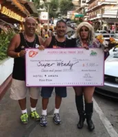 Soon Super Wendy started going to the gay beach on playa Los Muertos in the Super Wendy costume to promote her show. Her next job was for several years at the bar La Fiesta which was next to La Noche. There she really developed the Super Wendy show. Once La Noche added drag shows the Super Wendy show moved to La Noche for very successful 7 years.